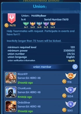 This is the best way to get into a good union besides knowing someone – messaging always gets better results than cold applying.  Especially if they are full. When I go to join a union I will 100% want to see full unions. I look up their elders and then message them and give them my power level and current weekly activity level and tell them I am looking for a more active union and ask if there is any room for me.